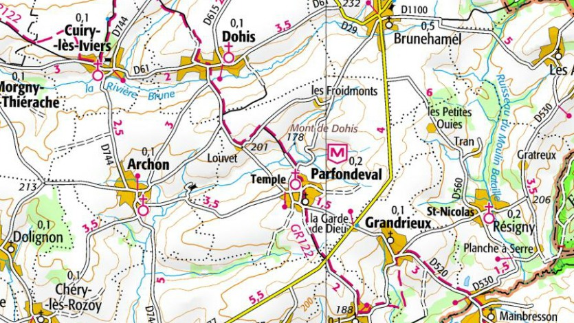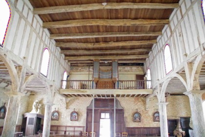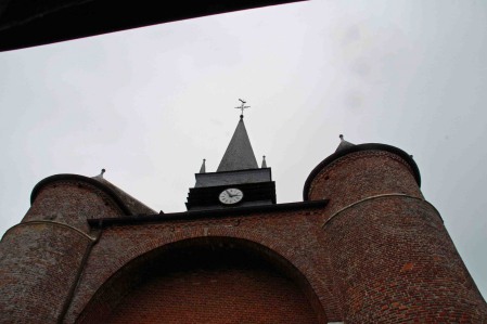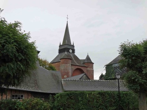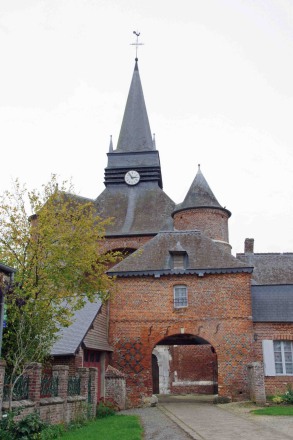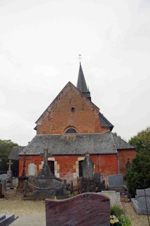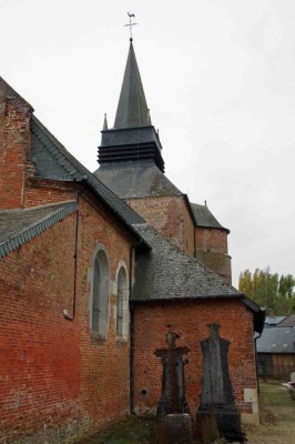 L'église construite en brique date des XVI ème et XVII ème siècles. Elle est composée de trois parties distinctes : le donjon de plan carré, encadré à l'ouest de deux tours rondes, la nef, dont la façade occidentale est ornée d'un étonnant portail de pierre blanche, de style Renaissance et finement sculpté, et, dans l'axe du donjon, le choeur à chevet plat, autrefois flanqué de deux tours rondes. Le donjon et la tourelle sont divisés en trois niveaux. Elle fait partie des église fortifiées de Thiérache.