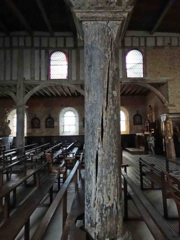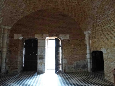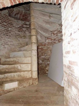 Salle inférieure de la tour-porche, escalier d'accès au niveaux supérieurs et hublot permettant d'observer la salle supérieure